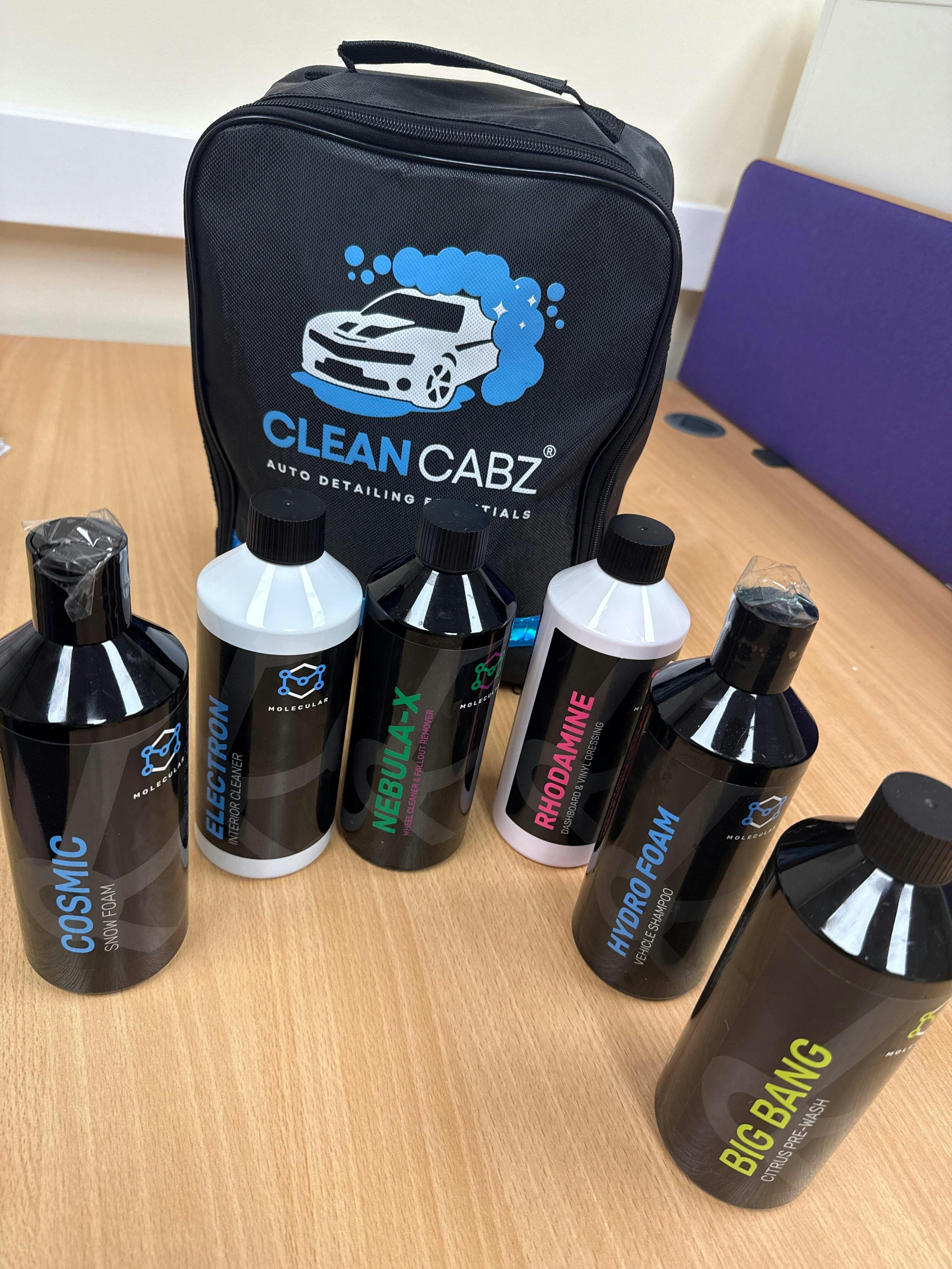 Collection of car cleaning products and tools with Clean Cabz branding on a white background